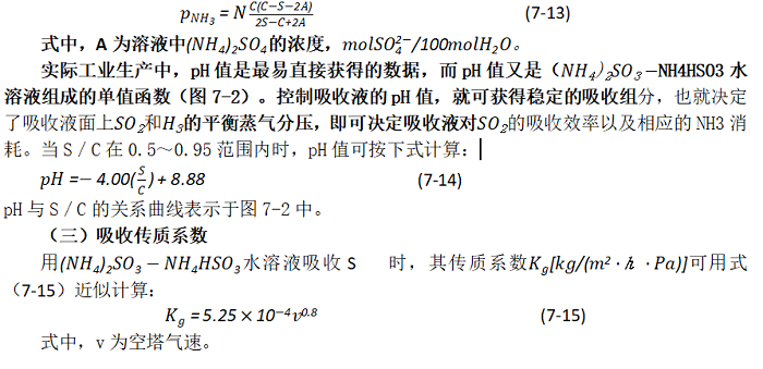 由以上敘述可知,(NH4)2SO3-NH4HSO3水溶液中的(NH4)2SO3與 NH4HSO3的組成狀況對吸收影響很大,而控制吸收液組成的重要依據是吸收液上的SO2 和NH3的分壓PSO2、PNH』。在吸收液pH值為4.71~5.96時,這些分壓值可用約翰斯通公式計算: