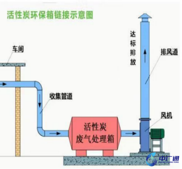 氣體進(jìn)入吸附床后,氣體中的有機(jī)物質(zhì)被活性炭吸附而著附在活性炭的表面,從而使氣體得以?xún)艋瑑艋蟮臍怏w再通過(guò)風(fēng)機(jī)排向大氣。